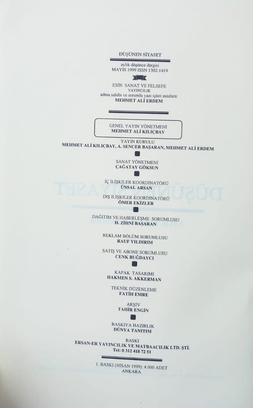 Düşünen Siyaset, Mayıs 1999 - Yazı, Ön/arka Kapak, Künye, İçindekiler
